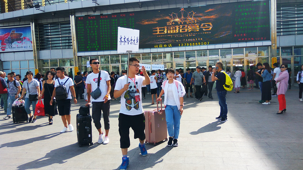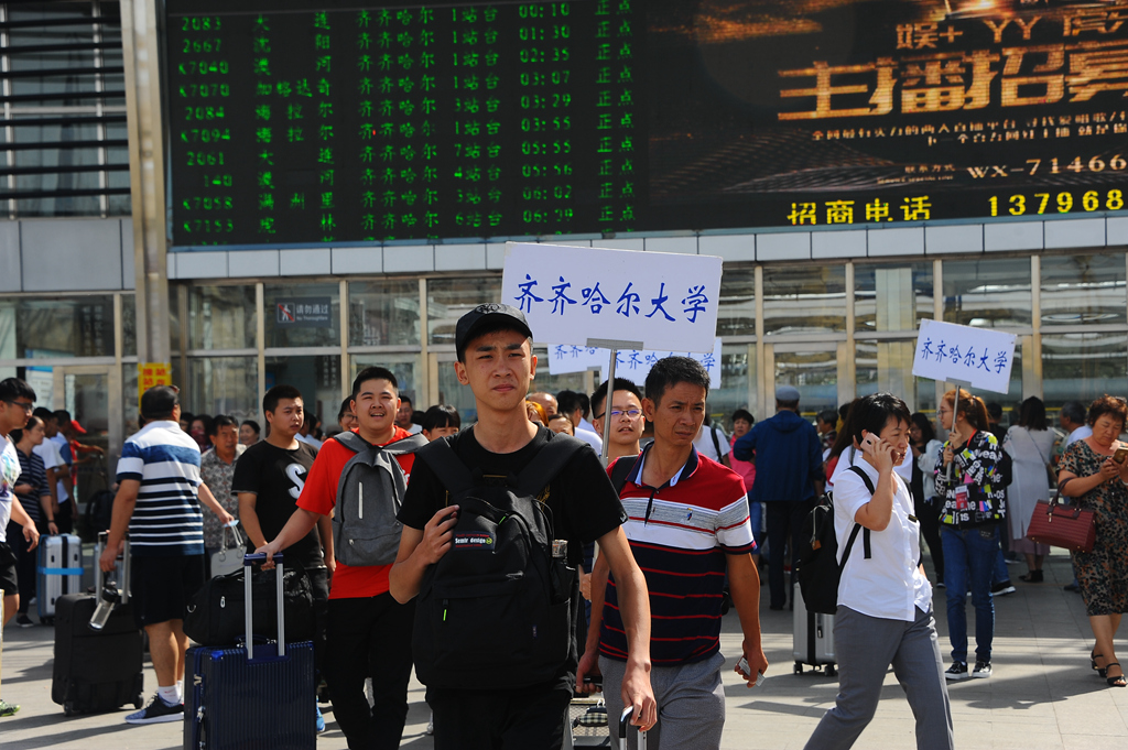 在齊齊哈爾火車站和齊齊哈爾南站,迎新的志愿者們打著引導(dǎo)牌、揮舞著旗幟,迎接剛剛走下火車的新生同學(xué)和家長,組織大家坐上接站班車,順利抵達(dá)學(xué)校。