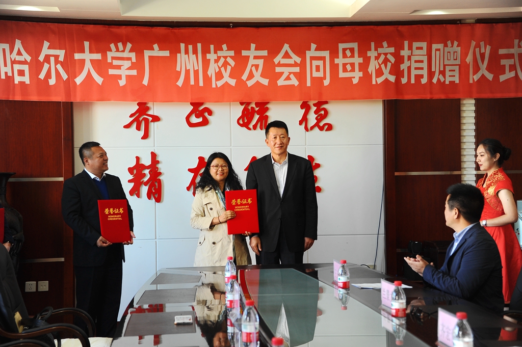 蘭景力為李敬民、劉德權(quán)、曾曉萍校友頒發(fā)捐贈證書