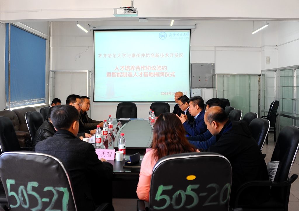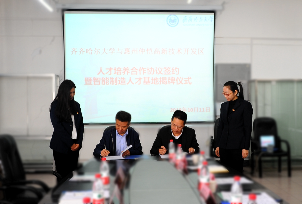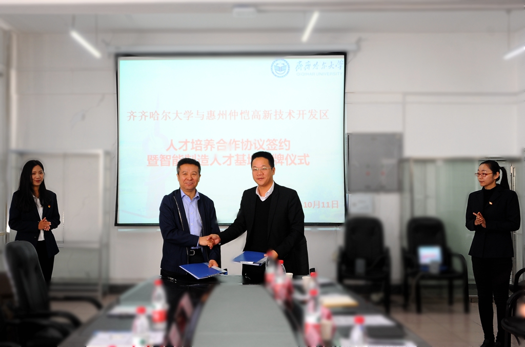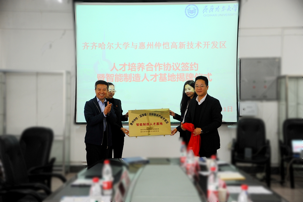 李英杰和許玉書分別代表齊齊哈爾大學和惠州仲愷高新技術產(chǎn)業(yè)開發(fā)區(qū)簽署了人才培養(yǎng)合作協(xié)議,并共同為惠州仲愷(國家級)高新技術產(chǎn)業(yè)開發(fā)區(qū)智能制造人才基地揭牌。