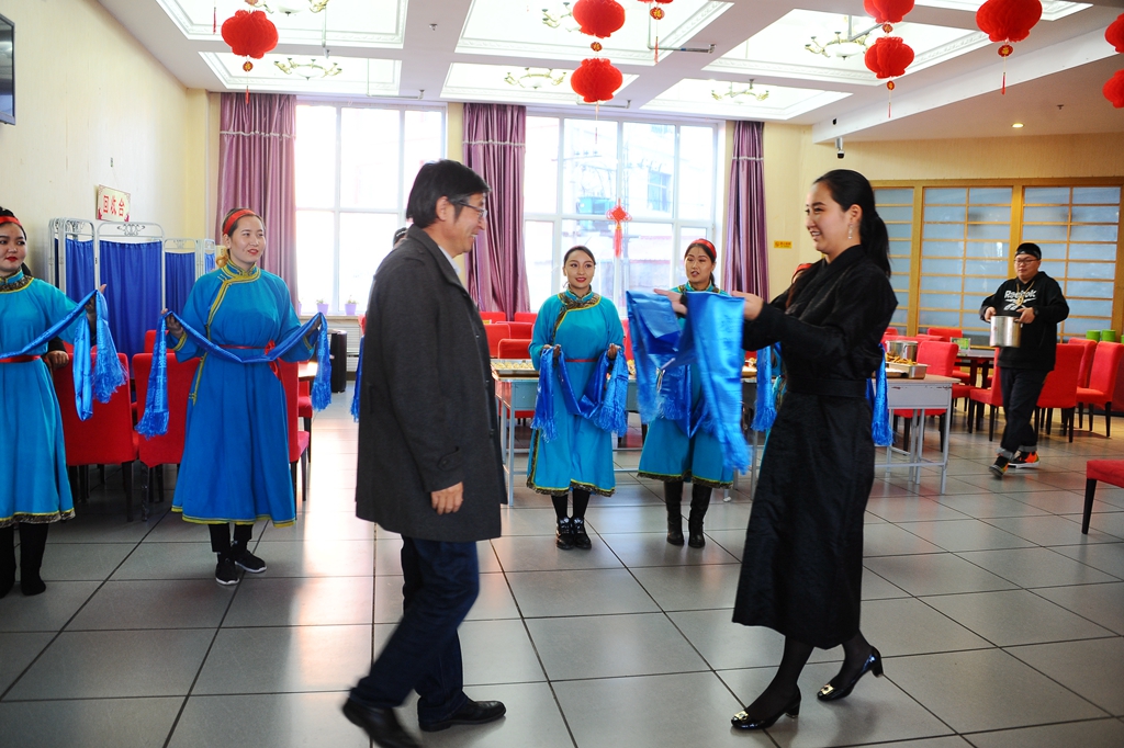 在傳統(tǒng)蒙古迎賓曲中,身著蒙古民族盛裝的留學(xué)生們向來賓敬獻(xiàn)了代表吉祥如意的藍(lán)色哈達(dá)。