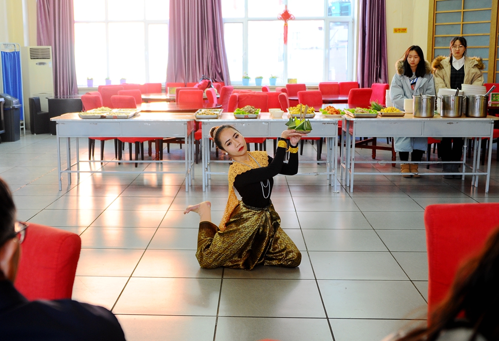 活動(dòng)中,泰國學(xué)生們跳起了傳統(tǒng)水燈節(jié)舞,韓國留學(xué)生徐正賢唱起了韓國民歌《阿里郎》,來自南美巴西的小伙子道格拉斯彈起尤克里里唱起巴西風(fēng)情的歌曲《浪花》。蒙古留學(xué)生演唱的蒙古歌曲《烏蘭巴托的夜》,唱出了蒙古草原夜色的寂靜,蒼涼悠遠(yuǎn),贏得了觀眾們的陣陣掌聲。