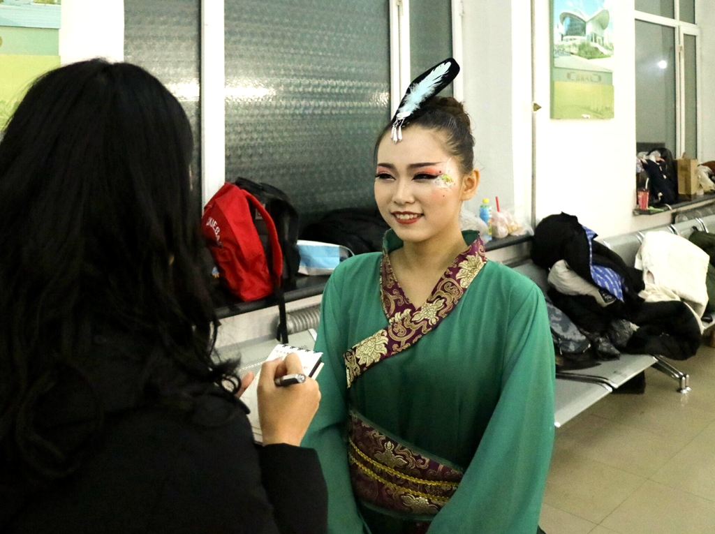 大學生記者團的學生記者采訪到了《半壺驚鴻舞盛世》的領舞、校博樂古典舞蹈與器樂協(xié)會會長于文浩,她說:“我們協(xié)會新成立不久,參與的演出不多,非常高興能參與這次研究生迎新文藝演出活動,希望通過我們的表演讓同學們欣賞到古典舞之美,也希望以后能有更多的機會給大家演出?!?/p>