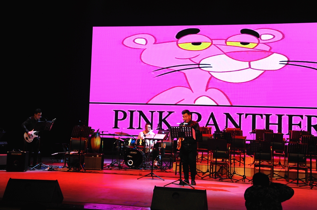 在真正的音樂中,充滿了無數(shù)種心靈的感受,比言詞更好得多。一曲由王鈺林等人彈奏的《Pink panther Theme》響起,伴著粉色熒屏上可愛搞怪的卡通人物,歡快而緊促的旋律,不禁讓觀眾想到粉紅豹躡手躡腳偷偷環(huán)視四周的搞怪場景,掀起了一場“粉紅色的回憶”。緊接著由趙雷等同學(xué)伴唱的《SaxMan》躁動了全場,多變的切分節(jié)奏以及即興加花變奏強勁高亢,激動奔放,直探聽者的心底,讓大家情不自禁地跟著節(jié)奏搖擺起來。