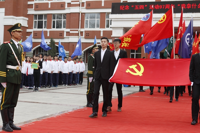 全體師生莊嚴(yán)禮贊中,學(xué)生代表出黨旗、團(tuán)旗