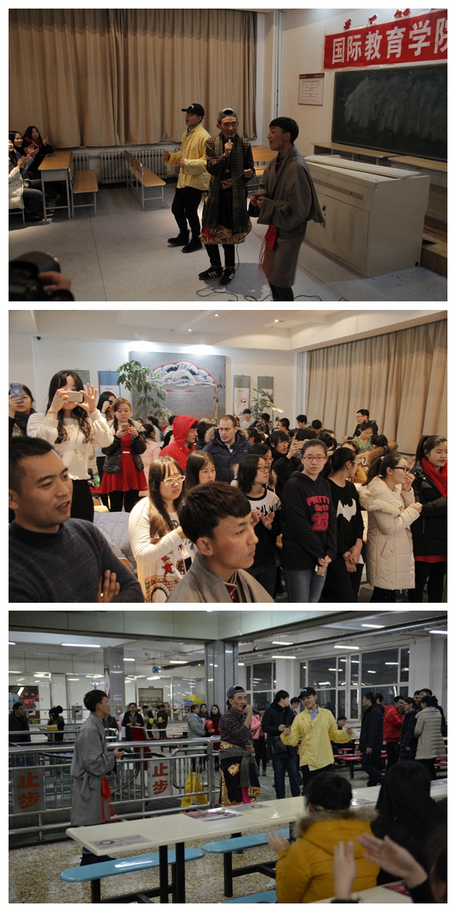 師生包餃子過(guò)新年活動(dòng)中,網(wǎng)絡(luò)人氣爆棚的“快閃哥”、藏族學(xué)生普達(dá)杰等“快閃團(tuán)”同學(xué)們?cè)诎溩邮程矛F(xiàn)場(chǎng)為同學(xué)們獻(xiàn)歌,同學(xué)們一起載歌載舞、互道吉祥,喜迎新年,十足的“文藝范”贏得了同學(xué)們熱烈的掌聲與叫好聲,集體過(guò)年的“年味”更濃了。