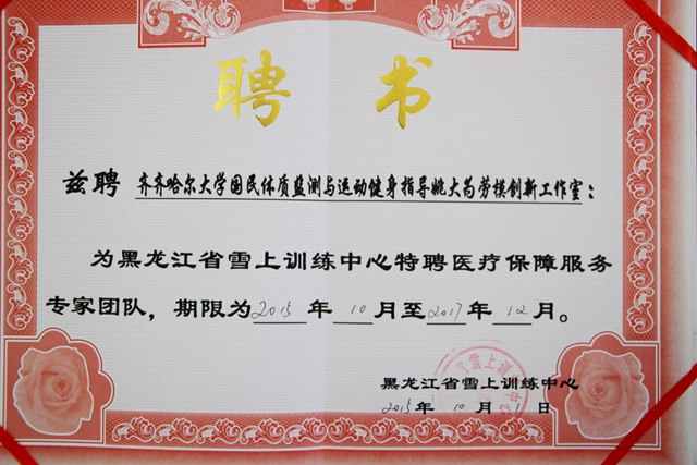 為備戰(zhàn)2018年平昌冬季奧運(yùn)會(huì),“齊齊哈爾大學(xué)國民體質(zhì)監(jiān)測與運(yùn)動(dòng)健身指導(dǎo)姚大為勞模創(chuàng)新工作室”被黑龍江省雪上訓(xùn)練中心特聘為醫(yī)療保障服務(wù)專家團(tuán)隊(duì),期限為2015年10月至2017年12月。