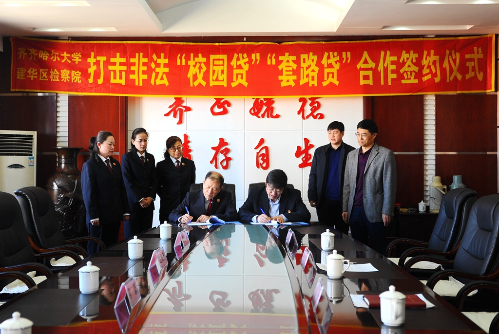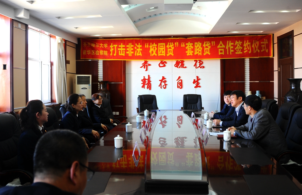 為保護在校學(xué)生依法使用助學(xué)貸款,嚴厲打擊非法“校園貸”“套路貸”等違規(guī)行為,保障學(xué)生合法權(quán)益不受損害,4月25日上午,我校與建華區(qū)人民檢察院合作簽約儀式在辦公樓504會議室舉行,建華區(qū)人民檢察院黨組書記、檢察長趙福忠,齊齊哈爾市人民檢察院民事檢察部部長常新,建華區(qū)人民檢察院副檢察長鄭雪冬,我校黨委副書記張文治、學(xué)生工作部(學(xué)生處)部(處)長姜波、武裝部(保衛(wèi)處)部(處)長杜海權(quán)等出席簽約儀式并進行了座談。張文治主持簽約儀式。