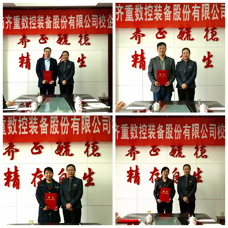簽約儀式上,校長陳桂芝代表學校與齊重數(shù)控裝備股份有限公司總經(jīng)理孫偉共同簽署了校企戰(zhàn)略合作協(xié)議,并為齊重數(shù)控裝備股份有限公司四位特聘碩士生導師頒發(fā)了聘書。