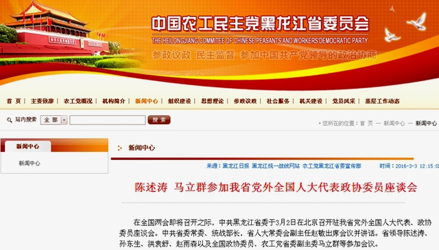 3月3日,農(nóng)工黨黑龍江省委網(wǎng)站以《陳述濤 馬立群參加我省黨外全國人大代表政協(xié)委員座談會》為題作了報道。