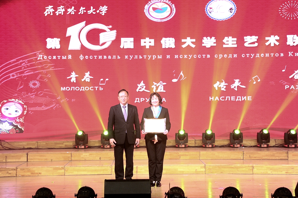 校長陳桂芝在致辭中指出,多年來,伴隨著國家和黑龍江省與俄羅斯各領(lǐng)域的友好深度合作,我校國際交流合作各項工作也取得了長足進(jìn)步。十年前,教育部批準(zhǔn)在我校設(shè)立了“中俄大學(xué)生藝術(shù)交流基地”,在國家“中俄語言年”活動框架下舉辦了首屆中俄大學(xué)生藝術(shù)聯(lián)歡節(jié)。在中俄兩國同仁的傾情奉獻(xiàn)下,在教育部、省教育廳、齊齊哈爾市委市政府的大力支持下,“齊齊哈爾大學(xué)中俄大學(xué)生藝術(shù)交流基地”已發(fā)展成為傳播中俄兩國人民的深情厚誼的重要舞臺。在今后的發(fā)展中,希望中俄兩國學(xué)子堅持“開放包容、互學(xué)互鑒、互利共贏”的理念,借助齊齊哈爾大學(xué)中俄大學(xué)生藝術(shù)交流基地這一平臺,展示中俄兩國文化,展現(xiàn)兩國青年人的青春風(fēng)采,促進(jìn)中俄青年友好交流,加強(qiáng)了解,增進(jìn)友誼,為兩國青年架起一座溝通的橋梁,為中俄兩國的友好譜寫新篇章!
