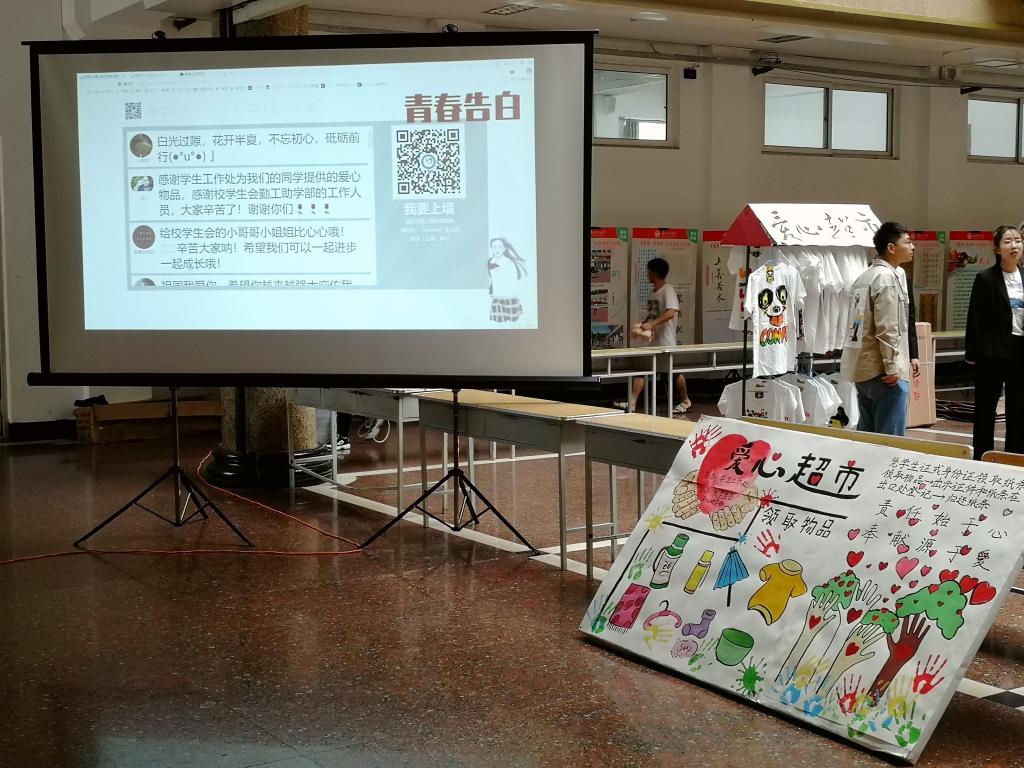 此外,在愛心超市“開市”同時(shí),學(xué)生工作部(處)還特別推出了“青春告白祖國(guó)”—微信平臺(tái)留言“上墻”活動(dòng)。同學(xué)們把自己對(duì)祖國(guó)的熱愛,對(duì)母校的感情化為點(diǎn)滴文字,投射到大屏幕上。