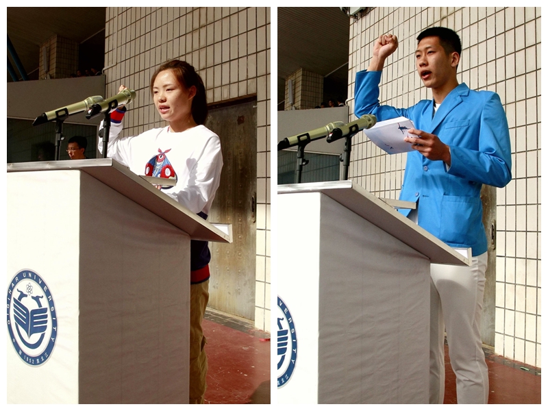運(yùn)動(dòng)員代表教育與傳媒學(xué)院新聞學(xué)專業(yè)151班趙君萍同學(xué)代表全體運(yùn)動(dòng)員宣誓,裁判員代表體育學(xué)院體育教育專業(yè)172班郜慶凱同學(xué)代表全體裁判員宣誓。
