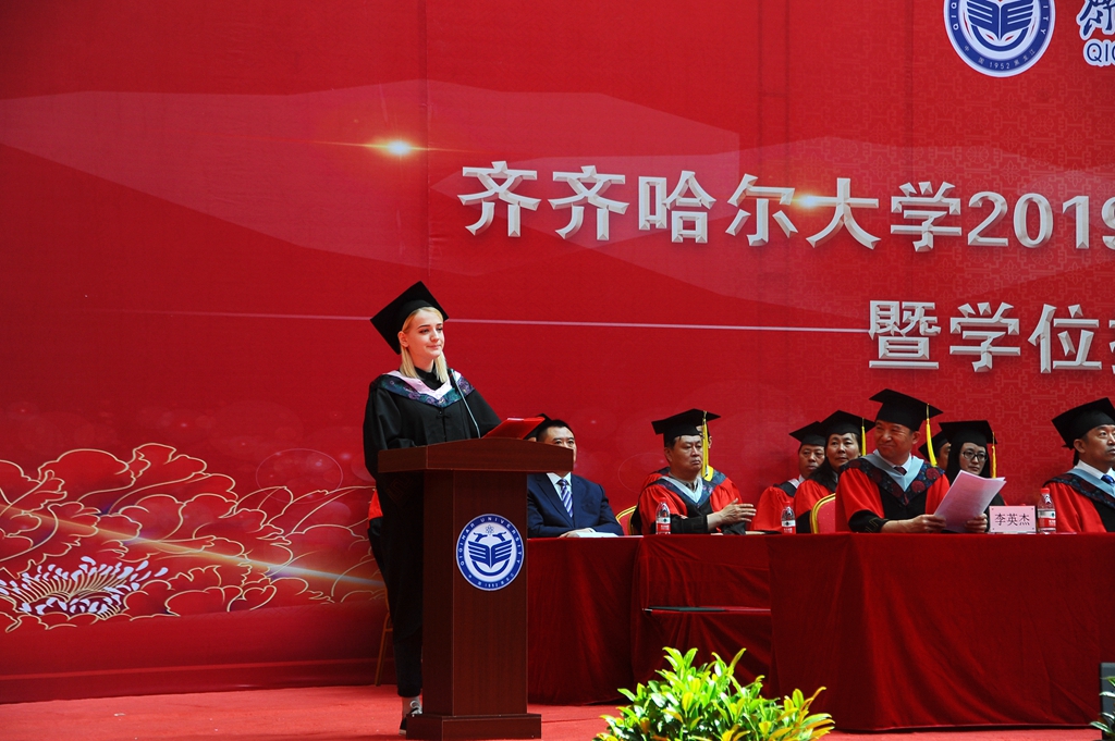 畢業(yè)留學生代表卡佳、碩士畢業(yè)生代表陳文晶、本科畢業(yè)生代表高麗先后在典禮上發(fā)言,他們深情地表達了對母校的感恩和不舍,對老師、同學的感激和祝福,并表示,作為齊大學子,一定會秉承“養(yǎng)正毓德 精存自生”的校訓精神,積極進取、努力拼搏,用自己的所學所能回饋社會、回報母校。