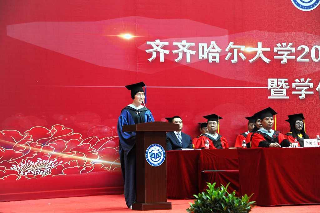 她說,回首一起走過的歲月,母校見證了你們一步步成長、成才,你們也親歷了母校巨大的發(fā)展變化。在此,我要向大家道一聲感謝,感謝你們一直以來對母校事業(yè)發(fā)展的支持與貢獻,也要感謝你們對母校不足、不周之處的理解和包容。把齊齊哈爾大學建設(shè)成為一所有特色地方高水平應(yīng)用型綜合大學,是每一個齊大人的共同理想,這個理想正在我們的共同努力下一步一步地變?yōu)楝F(xiàn)實。我相信,在不久的將來,你們每一個人都會為母校感到更加榮耀和自豪!此時此刻,作為校長和老師,我對全體畢業(yè)生除了道不盡的牽掛與祝愿,還有四點希望: