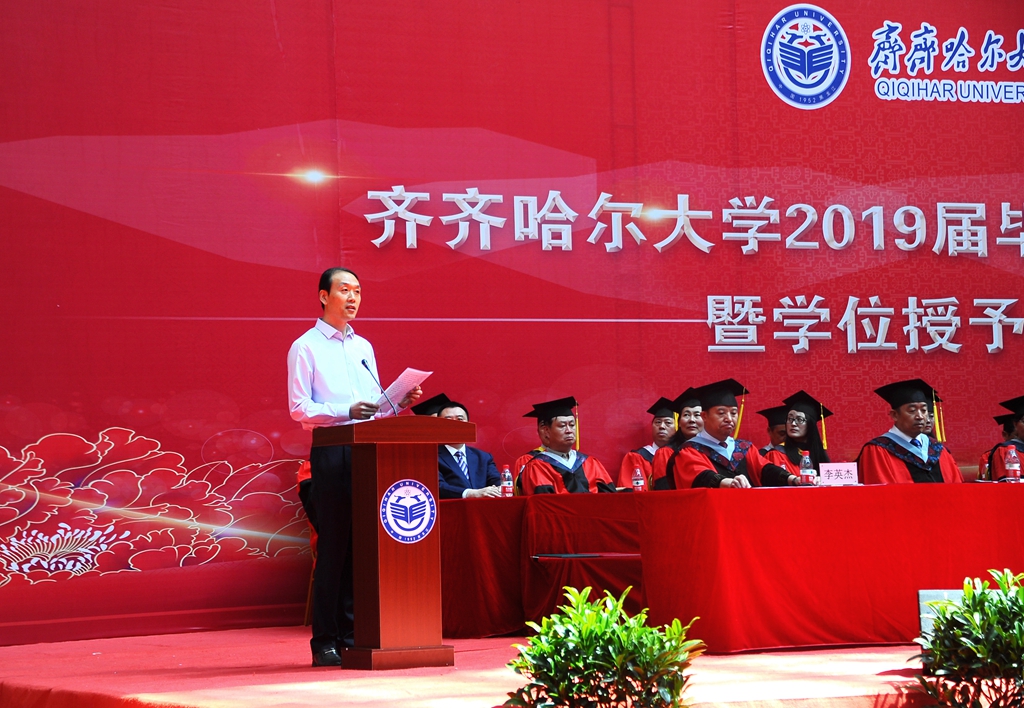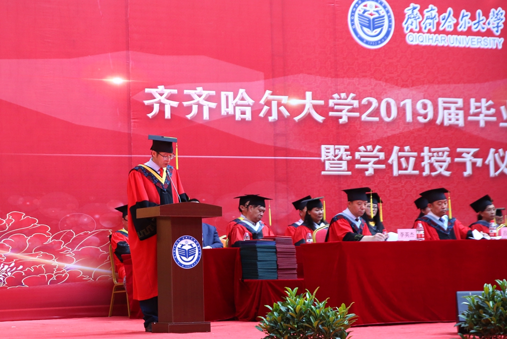 副校長呂厚均宣讀齊齊哈爾大學《關(guān)于準予本科生、研究生、留學生畢業(yè)的決定》。