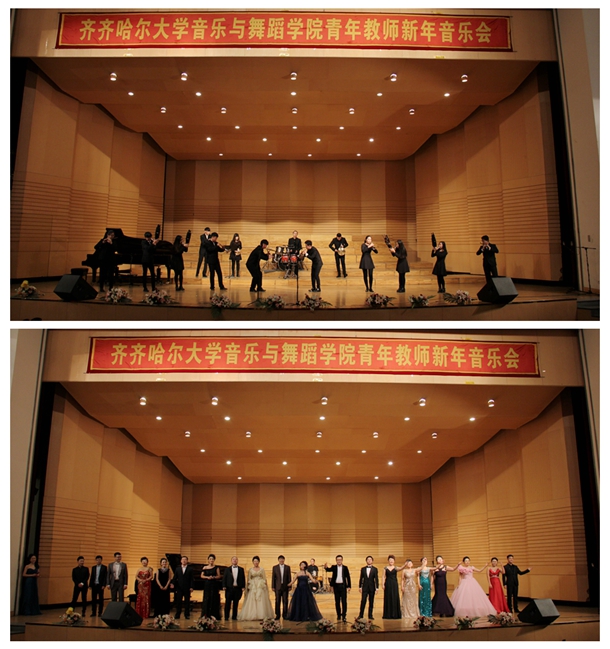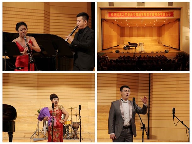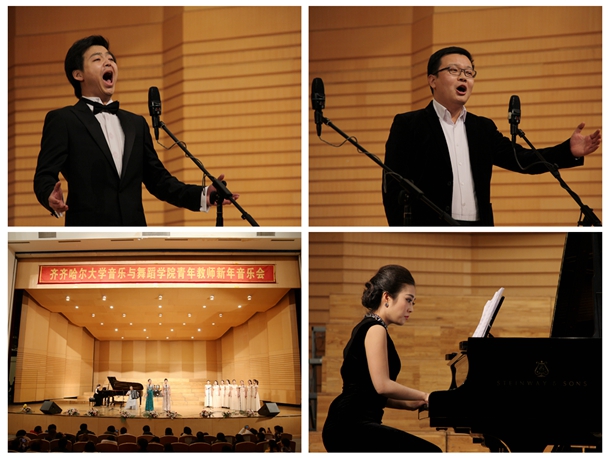 在新年來臨之際,音樂與舞蹈學院24名青年教師在臨近期末考試的有限時間內,犧牲了個人的寶貴時間,緊張排演了包括獨唱,二重唱,鋼琴獨奏,單簧管二重奏,小號獨奏,嗩吶獨奏等14個曲目,用美妙的歌聲和精湛的技藝,為現(xiàn)場的觀眾們送上了新春的祝福和深情的問候。