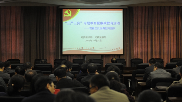 反腐倡廉,教育是基礎(chǔ)。為進(jìn)一步加強(qiáng)對黨員領(lǐng)導(dǎo)干部廉政教育,按照學(xué)?!蛾P(guān)于組織觀看< 踐行“三嚴(yán)三實”的好榜樣>、< 從瘋狂到滅亡>等正反面典型專題片的通知》部署,10月21日下午,黨委組織部、紀(jì)檢監(jiān)察處組織副處級以上領(lǐng)導(dǎo)干部在德潤大廈四樓會議室進(jìn)行“三嚴(yán)三實”專題教育暨廉政教育活動,集中觀看了《踐行“三嚴(yán)三實”的好榜樣》、《從瘋狂到滅亡》等正反典型專題片。