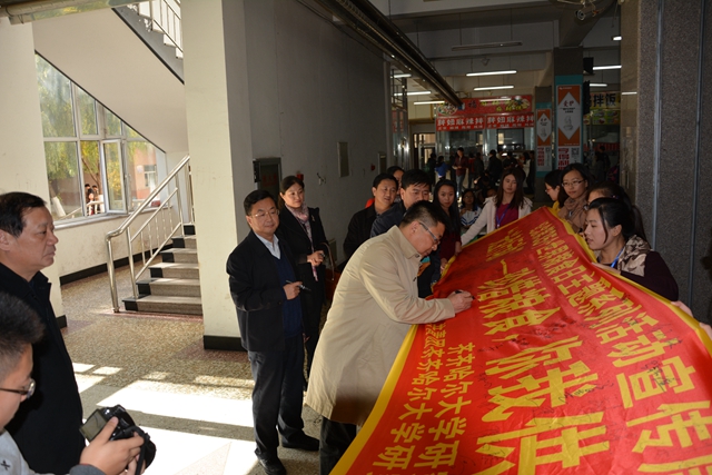 食堂午餐結(jié)束后,校領(lǐng)導、老師和參加活動的研究生在活動主題宣傳條幅上簽名,倡導“節(jié)約糧食,從我做起。”