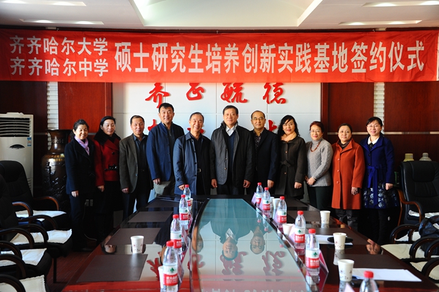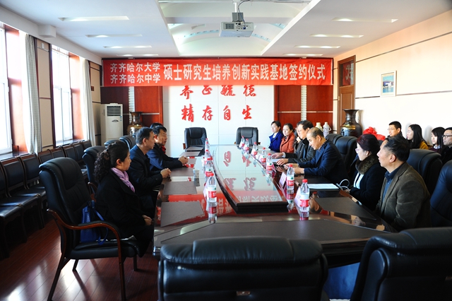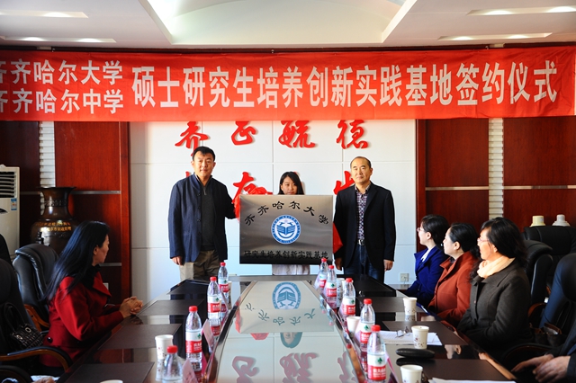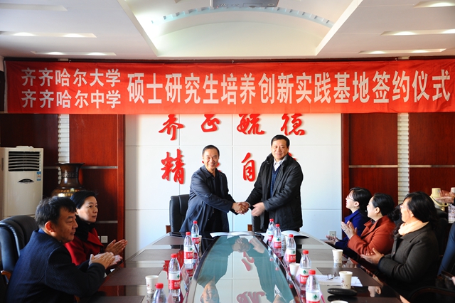 儀式上,校黨委常委、副校長鄧啟剛與齊齊哈爾中學(xué)校長許凱代表兩校簽訂了研究生培養(yǎng)創(chuàng)新實踐基地共建協(xié)議。校研究生部主任劉喜軍、齊齊哈爾中學(xué)黨委書記孫浩共同為基地揭牌。