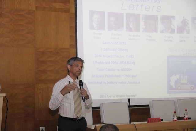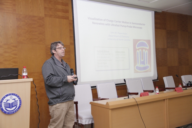 研討會上,Pranshant V. Kamat 教授、John M. Papanikolas教授和Kirk S. Schanze教授先后做了題為“Quantum Dots to Perovskites. Nanostructure Architectures for Light Energy Conversion”、“Materials and Interfaces for Solar Fuel Conversion”和“Visualization of Charge Carrier Dynamics in Semiconductor Nanowires Using Pump-Probe Microscopy”的報告。學(xué)術(shù)報告期間,我校師生積極與講座專家就生物材料與新能源納米材料發(fā)展問題,進行了學(xué)術(shù)交流和互動。