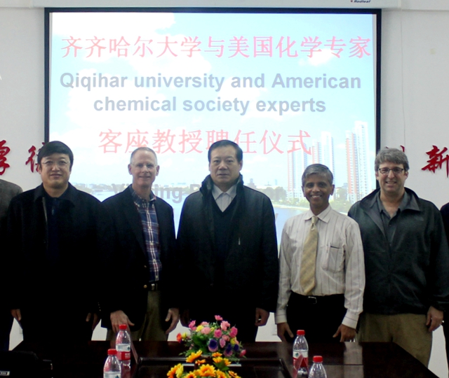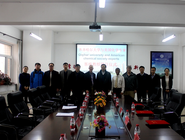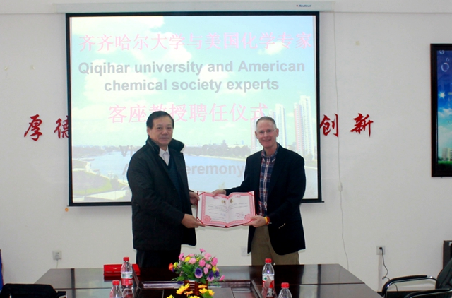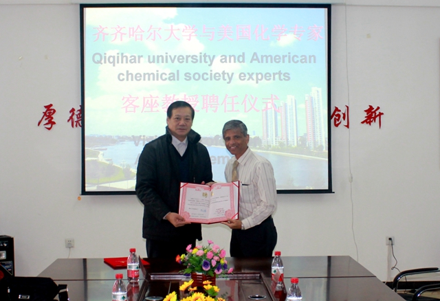 在研討會召開期間,齊齊哈爾大學(xué)分別聘任美國圣母大學(xué)Pranshant V. Kamat 教授、美國佛羅里達州立大學(xué)Kirk S. Schanze教授和美國北卡羅來納大學(xué)John M. Papanikolas教授為我?;瘜W(xué)工程與技術(shù)、材料科學(xué)與工程一級學(xué)科的客座教授,并舉行了受聘儀式。我校副校長鄧啟剛、人事處處長張文治、化學(xué)與化工學(xué)院院長郭祥峰、材料科學(xué)與工程學(xué)院院長楊長龍、研究生部副主任楊雷、科技處副處長荊濤及相關(guān)教師參加了聘任儀式。聘任儀式由材料科學(xué)與工程學(xué)院院長楊長龍主持。