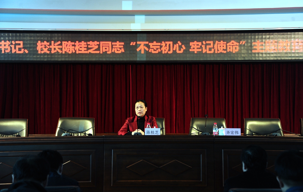 專題黨課上,陳桂芝從重溫習近平總書記關于“不忘初心、牢記使命”的重要論述入題,緊扣主題主線,層次分明地闡述了“什么是‘不忘初心、牢記使命’”、“為什么要‘不忘初心、牢記使命’”、“踐行初心使命,奮力推動學校高質量發(fā)展”等三方面內(nèi)容,闡明“不忘初心、牢記使命”是堅持黨的性質、踐行黨的宗旨的政治自覺,是從歷史汲取前進力量、永葆青春的政治動力,是中國共產(chǎn)黨自我革命的政治建設,是實現(xiàn)黨的歷史任務的政治追求。陳桂芝緊扣立德樹人根本任務,堅持問題導向,緊密聯(lián)系學校實際,緊密結合調(diào)研課題,對學校推進內(nèi)涵式發(fā)展建設面臨的矛盾問題,提出了有針對性的整改思路和舉措。