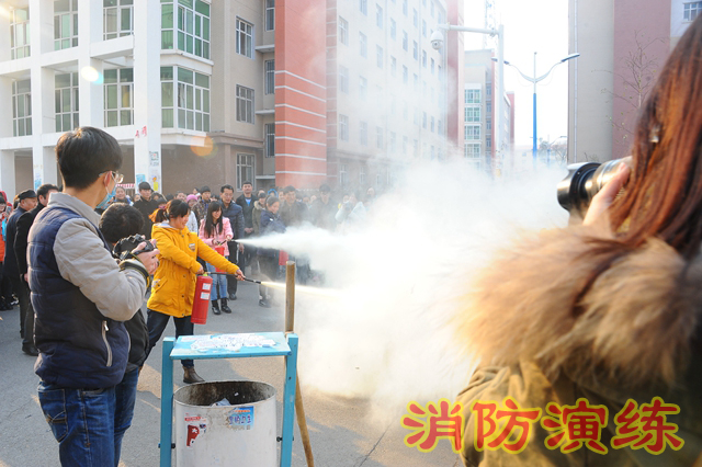 保衛(wèi)處梁力強(qiáng)老師為學(xué)生現(xiàn)場(chǎng)演示消防器材的使用,并邀請(qǐng)十幾名學(xué)生動(dòng)手實(shí)踐,使用滅火器滅火。