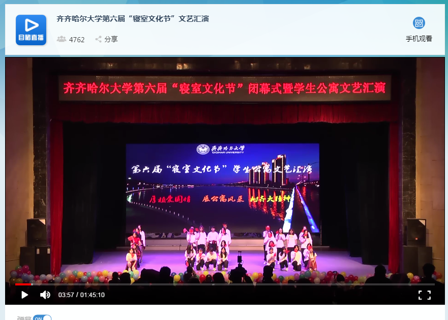 按照《齊齊哈爾大學(xué)第六屆“寢室文化節(jié)”實施方案》安排,11月27日晚7點,齊齊哈爾大學(xué)第六屆“寢室文化節(jié)”閉幕式暨“厚植愛國情,展公寓風(fēng)采,樹齊大精神”學(xué)生公寓文藝匯演在我校文化宮隆重舉行。學(xué)校黨委副書記張文治出席活動,機(jī)關(guān)黨委、招生就業(yè)處、武裝部(保衛(wèi)處)、校團(tuán)委、學(xué)生工作部(學(xué)生處)、宣傳部等部門負(fù)責(zé)人,各學(xué)院主管學(xué)生工作的領(lǐng)導(dǎo)、學(xué)生工作辦公室主任、輔導(dǎo)員,各公寓管理員、公寓輔導(dǎo)員、各級學(xué)生組織代表、外國留學(xué)生代表及各學(xué)院學(xué)生代表、返回母校的畢業(yè)生代表等1400余人共同觀看了本次文藝匯演,晚會實況通過“目睹直播”在網(wǎng)絡(luò)上同步直播。
