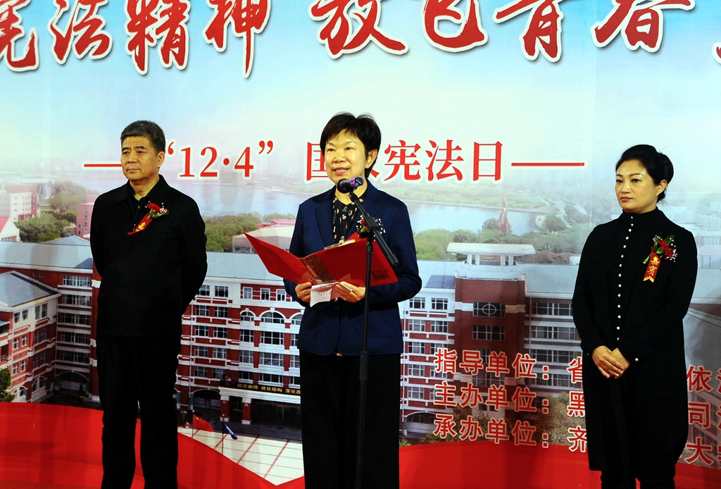 何晶在致辭中說,近年來,在省委、省政府和省級各部門的堅強(qiáng)領(lǐng)導(dǎo)下,齊齊哈爾市委、市政府堅持圍繞中心,服務(wù)大局,以法律“七進(jìn)”為載體,開展了卓有成效的普法宣傳教育活動,取得了一定成績。本次高校法治文化節(jié)將通過校園法治作品展、憲法宣傳短片及法治文藝演出等形式全方位的展現(xiàn)齊齊哈爾市和齊齊哈爾大學(xué)在法治文化建設(shè)、“誰執(zhí)法誰普法”普法責(zé)任制實施、“七五”普法規(guī)劃落實等方面的工作成果。希望借這次活動的東風(fēng),再次掀起崇尚憲法、學(xué)習(xí)憲法、遵守憲法、維護(hù)憲法、運用憲法的新熱潮,推動憲法扎根社會、惠及百姓,為實現(xiàn)全面依法治國貢獻(xiàn)力量!