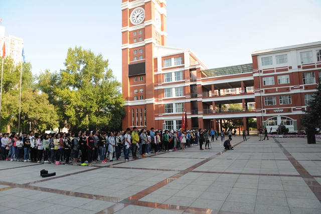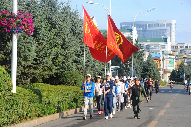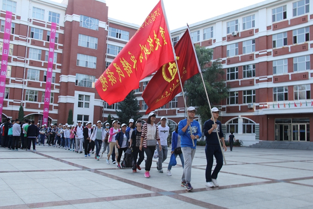 7:20,我校由100名師生組成的徒步隊(duì)伍在旗手的引導(dǎo)下踏上征程,從中區(qū)廣場(chǎng)出發(fā),徒步經(jīng)廣播電視大學(xué)、新明大街、錦繡家園、永安大街、永安立交橋,行至大民鎮(zhèn)。