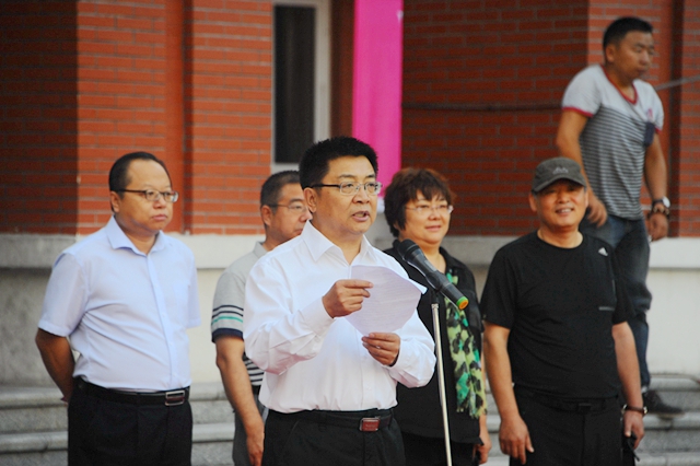 校黨委副書(shū)記蓋元臣宣布重走抗戰(zhàn)路隊(duì)伍出發(fā)。