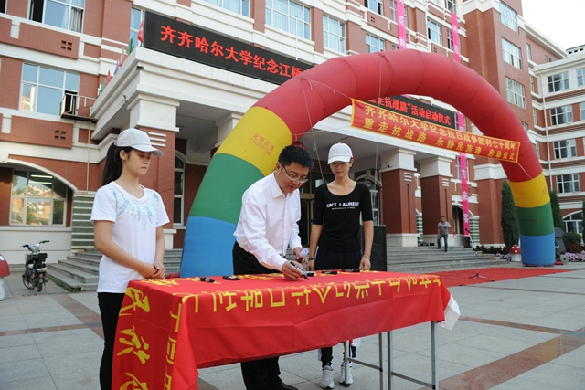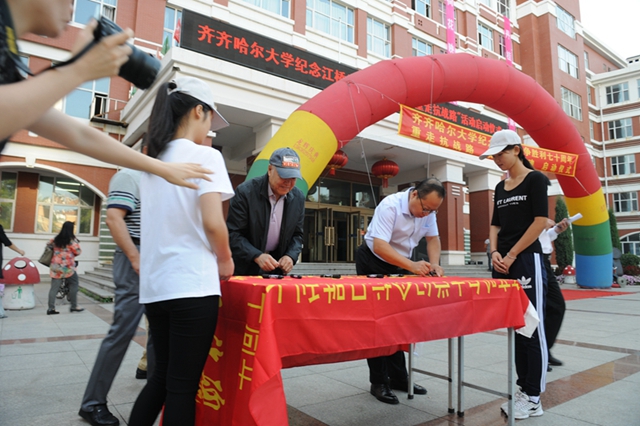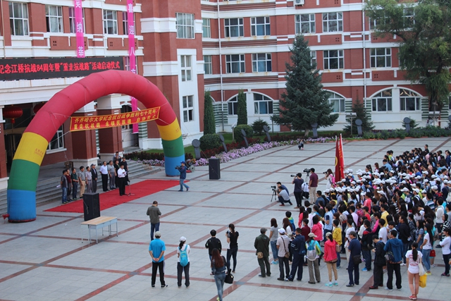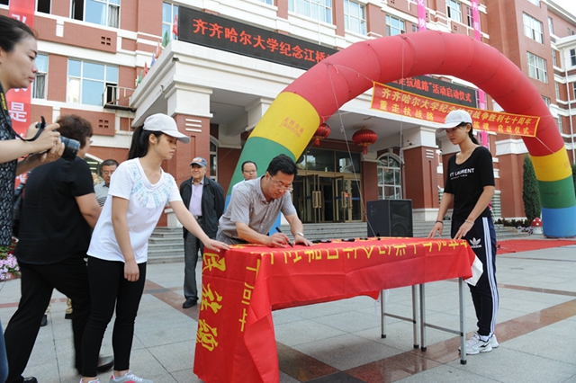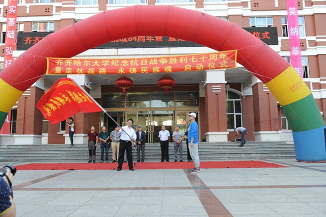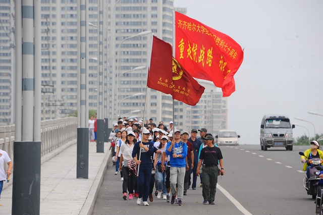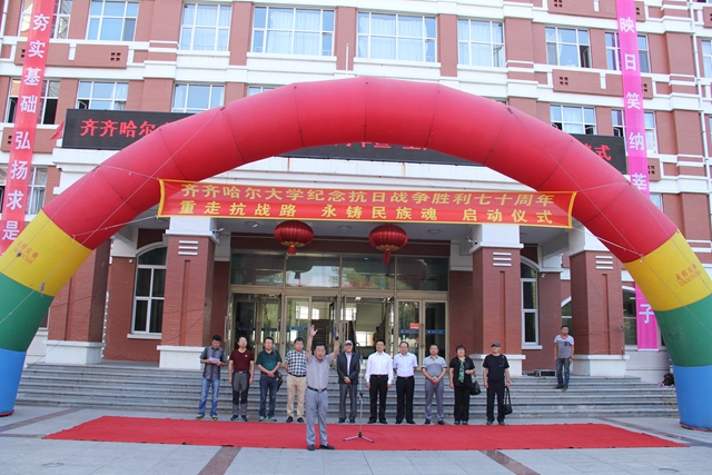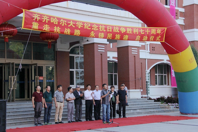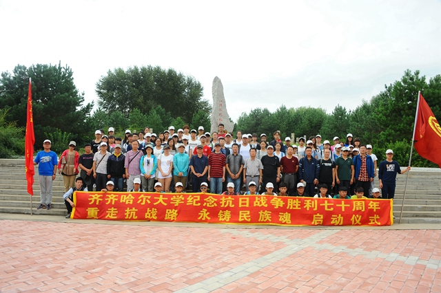 校黨委書(shū)記李海紅在啟動(dòng)儀式上講話(huà)。他說(shuō),今天,我們?cè)谶@里舉行一個(gè)隆重而莊嚴(yán)的儀式,為齊齊哈爾大學(xué)“重走抗戰(zhàn)路”的百名師生出征壯行。同學(xué)們將沿著愛(ài)國(guó)將軍馬占山當(dāng)年出征抗戰(zhàn)的行軍路線(xiàn),步行到達(dá)打響中國(guó)軍隊(duì)武裝抗日第一槍的地方——泰來(lái)縣江橋鎮(zhèn),并以此紀(jì)念70年前那場(chǎng)偉大的民族勝利。