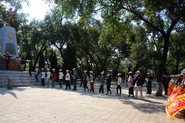 9:26,結(jié)束了2個(gè)小時(shí)、12公里的徒步路程,師生們從大民鎮(zhèn)乘車(chē)赴昂昂溪蘇軍烈士陵園憑吊英魂。紀(jì)念碑前,師生們心潮澎湃,一束束黃色的菊花寄托深情。