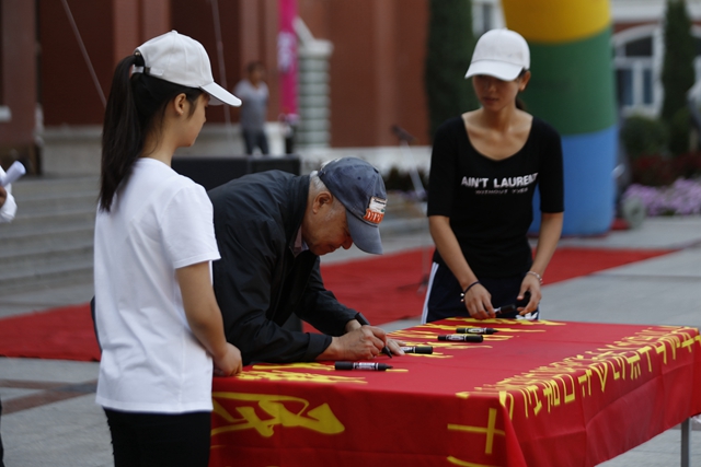 出席活動(dòng)的省、校、市領(lǐng)導(dǎo)在“紀(jì)念抗日戰(zhàn)爭(zhēng)勝利70周年‘重走抗戰(zhàn)路 永鑄民族魂’啟動(dòng)儀式”橫幅上簽名。