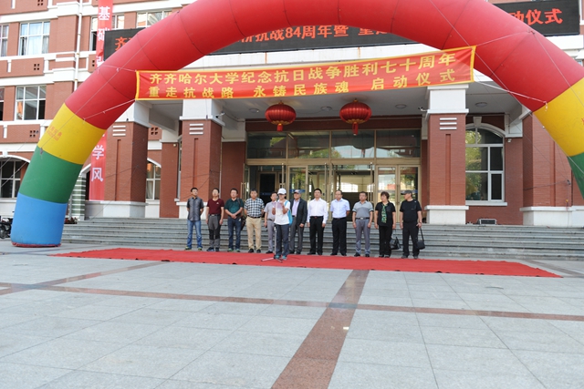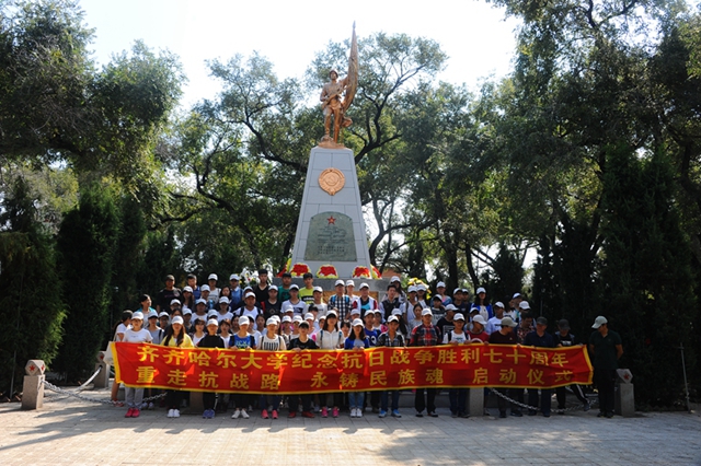 他指出,每一個(gè)時(shí)代都有屬于自己的民族英雄和先驅(qū)者,任何一個(gè)民族和國(guó)家在其歷史發(fā)展過(guò)程中都承載著自己的傳統(tǒng)文化與精神。我們每一次的紀(jì)念,都是在感悟一種思想,傳承一種文化,尋求著我們民族精神的延續(xù)。盡管歲月滄桑,當(dāng)年的江橋已不在,然而江橋抗戰(zhàn)精神永存。我們高興地看到齊齊哈爾大學(xué)同學(xué)們第四次“重走抗戰(zhàn)路”,在這塊流淌過(guò)先烈熱血的土地上,以更直接的方式親近歷史,以更富于挑戰(zhàn)自我的行為去深刻感受歷史對(duì)現(xiàn)實(shí)的啟示,以自己的實(shí)際行動(dòng)表達(dá)著對(duì)歷史的緬懷,對(duì)英雄的尊重,希望同學(xué)們克服困難,收獲我們這代人應(yīng)有的使命、責(zé)任和擔(dān)當(dāng),向全市人民、全省人民、全國(guó)人名展示齊齊哈爾大學(xué)同學(xué)們的時(shí)代風(fēng)采。