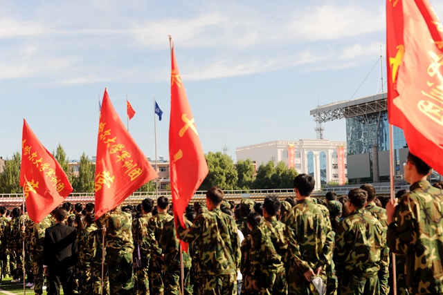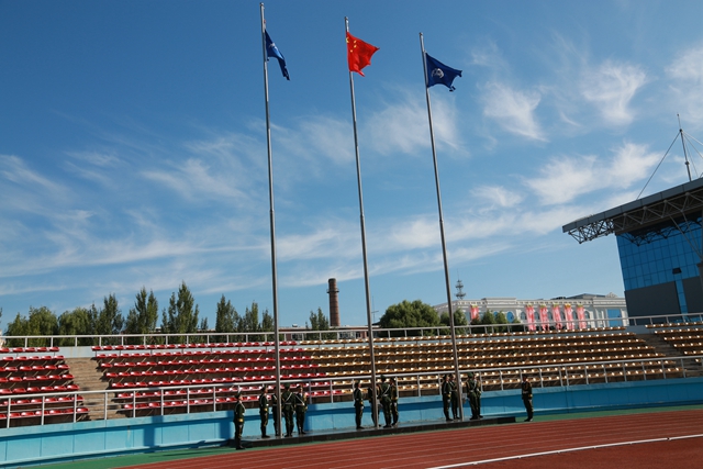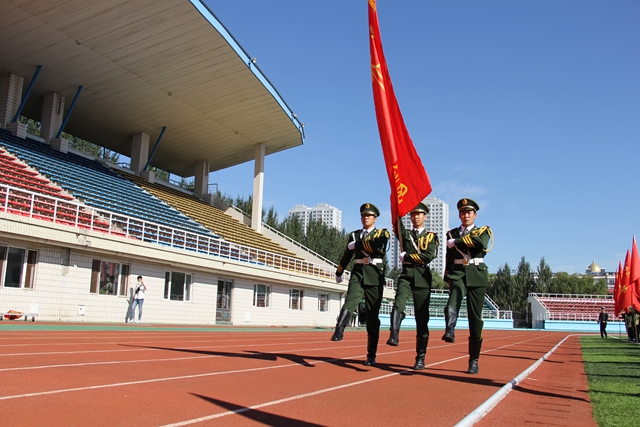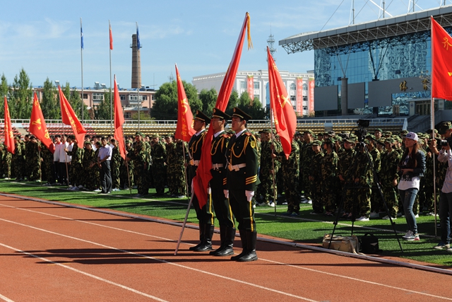 學生代表迎“齊齊哈爾大學軍訓團團旗”