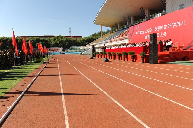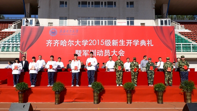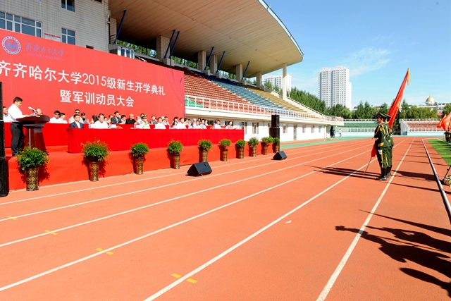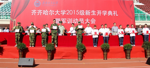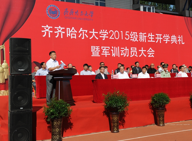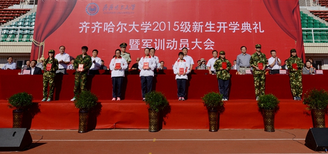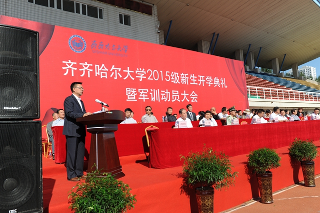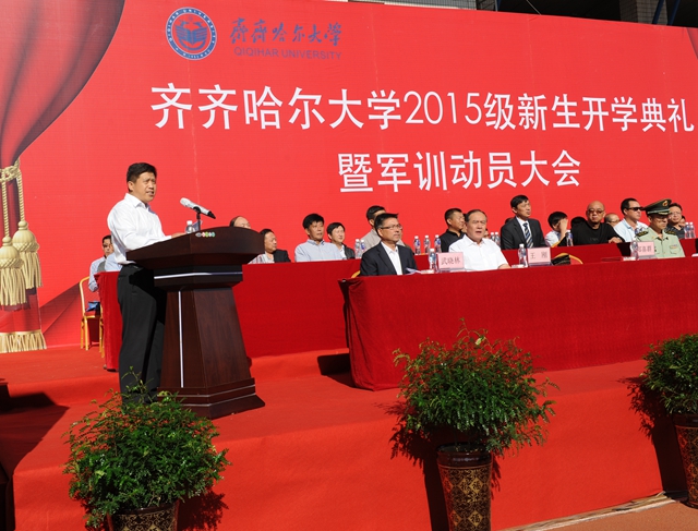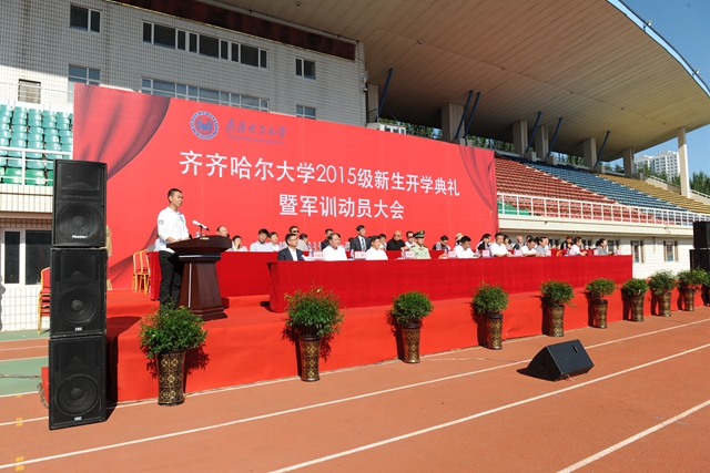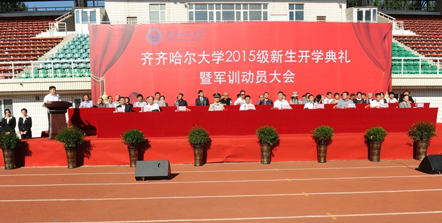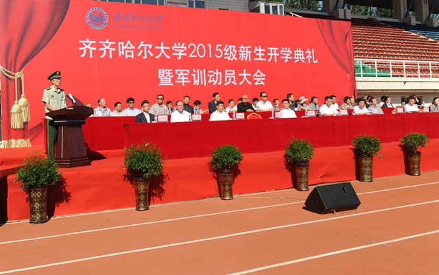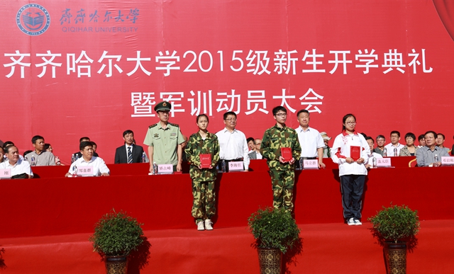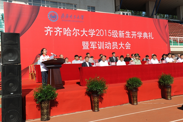 校黨委書記李海紅,校長馬立群同志,校黨委副書記蓋元臣,常務副校長鄭喜群,副校長鄧啟剛、王剛、李英杰,黨委常委、組織部部長齊宏偉,承訓部隊首長、武警齊齊哈爾支隊副參謀長矯占峰中校,特邀嘉賓,我校優(yōu)秀校友代表、工業(yè)分析專業(yè)八八屆畢業(yè)生、大慶油田勘探開發(fā)研究院總工程師、北京奧運會火炬手、全國“五一”勞動獎章獲得者、全國勞動模范伍曉林等出席典禮并在主席臺前排就坐。各學院院長、黨委書記、軍訓團組成單位領導,來自全國各地的2015級新同學(本科生、研究生)參加了開學典禮。
