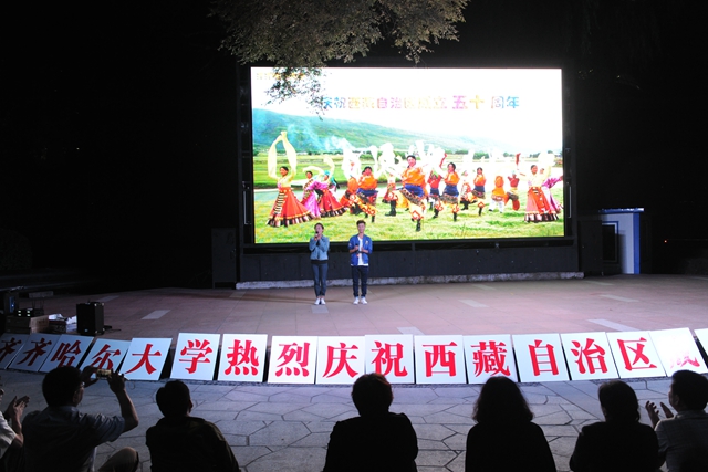 “齊齊哈爾大學(xué)慶祝西藏自治區(qū)成立50周年”由校學(xué)生會(huì)主席、來自黑龍江牡丹江的女孩劉燁瑋同學(xué)與來自西藏自治區(qū)墨脫縣的門巴族小伙子曲登尼瑪同學(xué)聯(lián)袂主持。