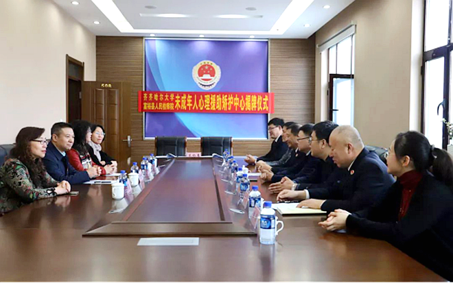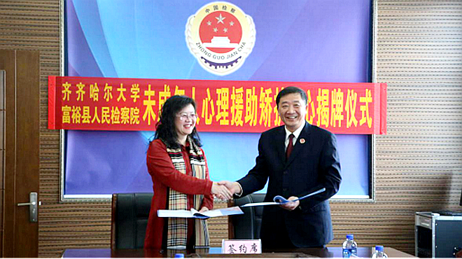 為更好地履行高校服務(wù)社會職能,預(yù)防青少年違法犯罪,促進(jìn)社會和諧,幫助未成年人解決成長中遇到的心理問題,拓寬學(xué)生校外實踐渠道,2019年12月31日上午,我校教師教育學(xué)院與富裕縣檢察院合作簽約暨“齊齊哈爾大學(xué)教學(xué)實踐基地”“齊齊哈爾大學(xué)未成年人心理援助矯護(hù)中心”揭牌儀式在富??h人民檢察院五樓會議室舉行。副校長李英杰,齊齊哈爾市人民檢察院黨組成員、副檢察長黃大力,富??h人民檢察院黨組書記、檢察長李雪峰等相關(guān)負(fù)責(zé)人出席了簽約儀式,我校教師教育學(xué)院、教務(wù)處等相關(guān)單位負(fù)責(zé)人和教師參加儀式。儀式由富??h人民檢察院黨組成員、副檢察長付武主持。