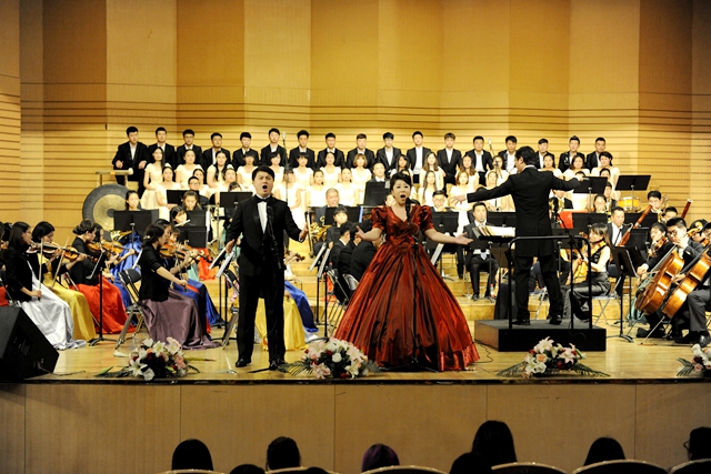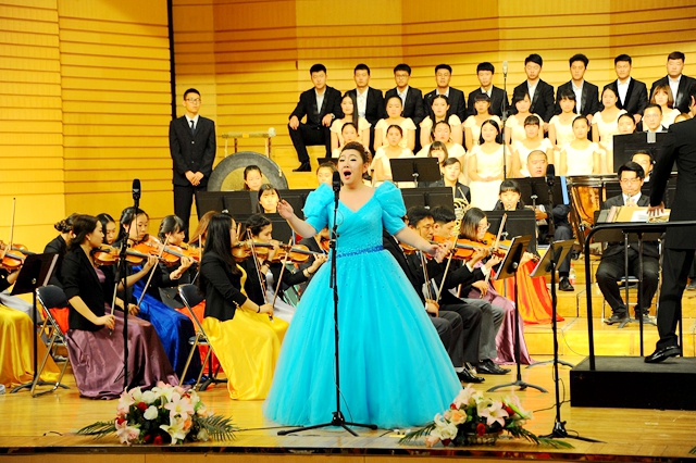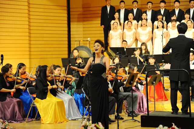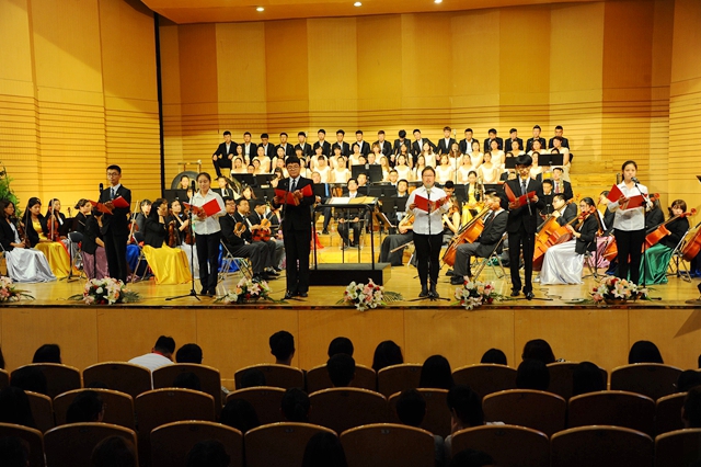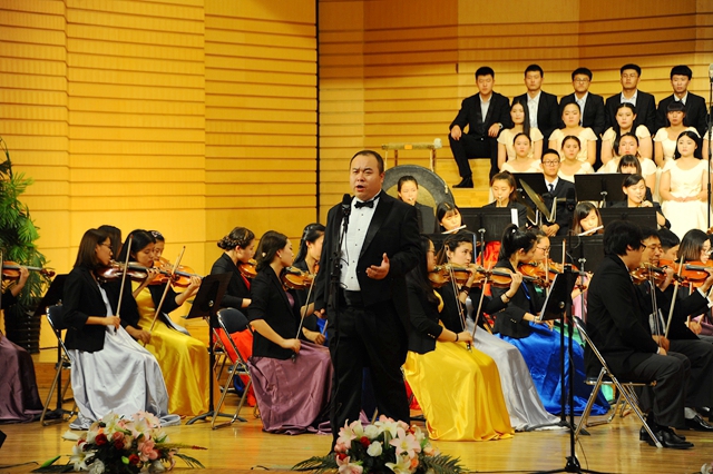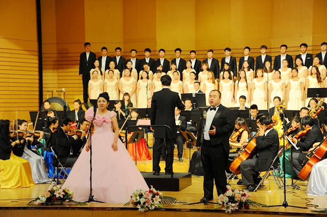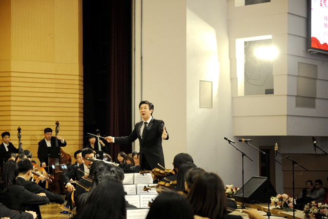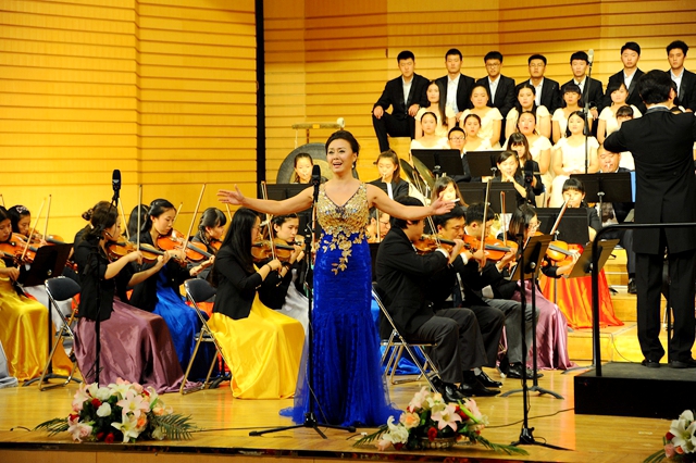 在播放視頻片和紀(jì)念抗戰(zhàn)勝利征文頒獎儀式后,“齊齊哈爾大學(xué)紀(jì)念中國人民抗日戰(zhàn)爭暨世界反法西斯戰(zhàn)爭勝利70周年文藝晚會”在交響樂團(tuán)陳曦澤指揮的交響序曲《紅旗頌》中拉開帷幕。