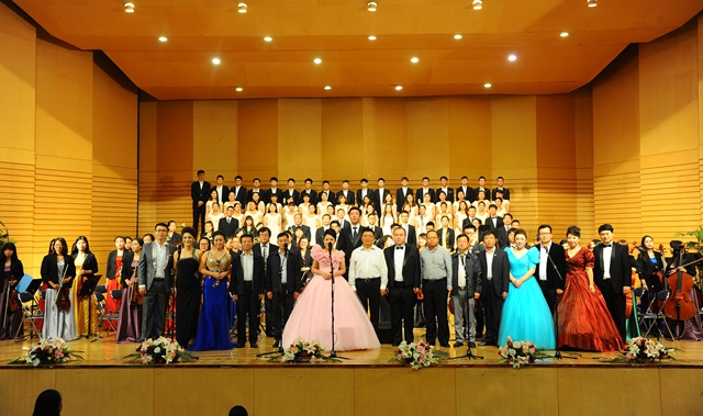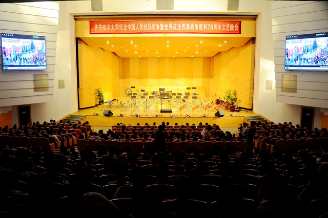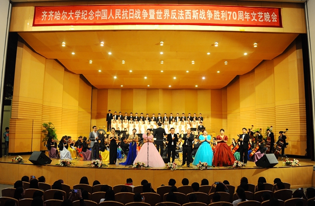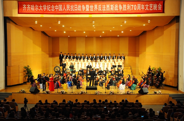在全體演職人員合唱《走向復(fù)興》歌聲中,齊齊哈爾大學(xué)紀(jì)念中國人民抗日戰(zhàn)爭暨世界反法西斯戰(zhàn)爭勝利70周年文藝晚會圓滿結(jié)束。