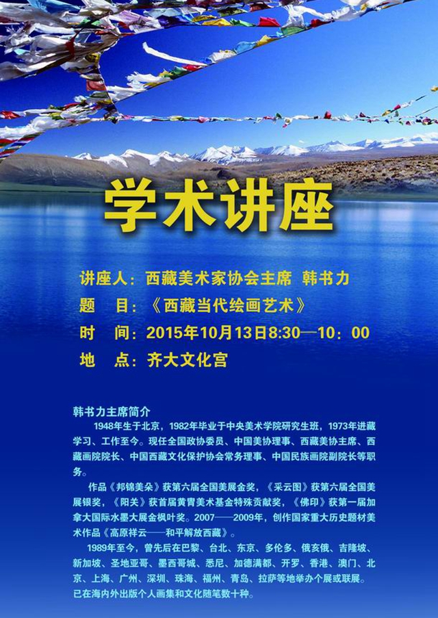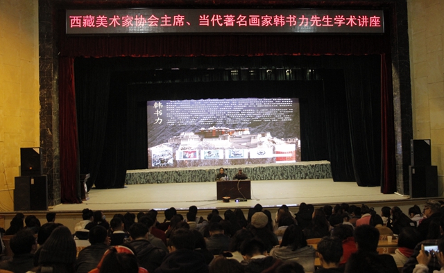 10月13日上午,應(yīng)邀來(lái)訪我校并出席在我校舉行的“西藏自治區(qū)成立50周年暨從西藏高原到嫩江平原美術(shù)作品展”的西藏美術(shù)家協(xié)會(huì)主席、著名畫(huà)家韓書(shū)力先生在校文化宮為我校師生做了題為《西藏當(dāng)代繪畫(huà)藝術(shù)》的學(xué)術(shù)講座。