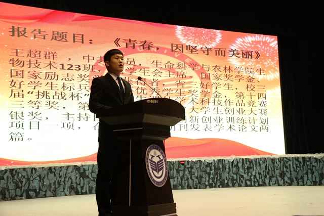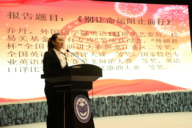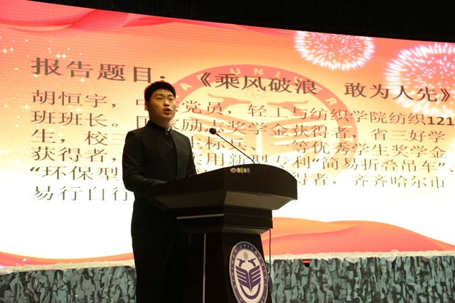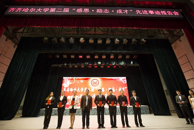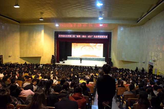 “左手夢(mèng)想,右手綻放;雙手擎起,責(zé)任擔(dān)當(dāng)!”齊齊哈爾大學(xué)第二屆“感恩?勵(lì)志?成才”先進(jìn)事跡報(bào)告團(tuán)的七名同學(xué),有綜合成績(jī)拔尖、學(xué)習(xí)能力突出的學(xué)習(xí)標(biāo)兵;有堅(jiān)強(qiáng)剛毅、在貧困和逆境中迎難而上的自強(qiáng)之星;有在大學(xué)生科技創(chuàng)新、社會(huì)實(shí)踐等方面表現(xiàn)突出的單項(xiàng)先鋒;還有視親情如生命一心回報(bào)的命運(yùn)斗士。他們是綜合能力強(qiáng)、善于總結(jié)、善于分享的杰出在校學(xué)生代表。在他們的身上,集中體現(xiàn)了3萬(wàn)名齊大學(xué)子“致知 致用 致遠(yuǎn)”的優(yōu)良學(xué)風(fēng)。學(xué)校希望全體同學(xué)以他們?yōu)榘駱樱膽迅卸?,?lì)志青春,奮發(fā)成才,肩負(fù)起當(dāng)代大學(xué)生的責(zé)任與擔(dān)當(dāng),在實(shí)踐中國(guó)夢(mèng)的偉大征途中筑夢(mèng)人生。