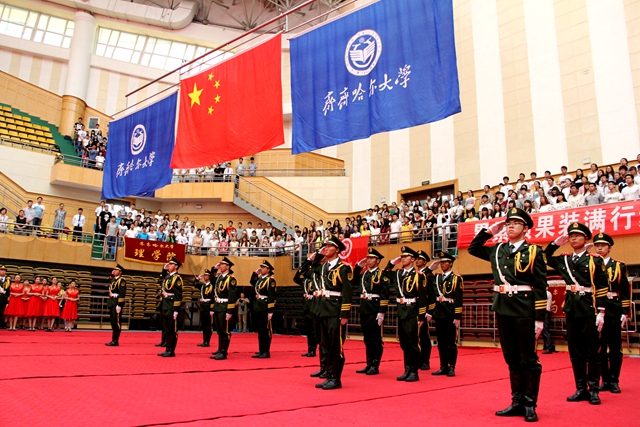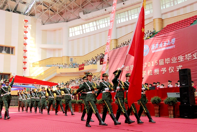 齊齊哈爾大學(xué)2015屆畢業(yè)生畢業(yè)典禮暨學(xué)位授予儀式舉行了隆重的升旗儀式。學(xué)校國旗班同學(xué)戎裝出旗,步履鏗鏘。