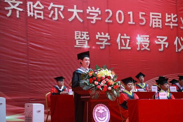 在全場熱烈的掌聲中,馬立群校長為2015屆畢業(yè)生送上母校的囑托、希望和祝福。他說,今天,我們在這里隆重舉行齊齊哈爾大學(xué)2015屆畢業(yè)生畢業(yè)典禮暨學(xué)位授予儀式。首先,我謹(jǐn)代表學(xué)校,向付出多年努力、圓滿完成學(xué)業(yè)的同學(xué)們致以最熱烈的祝賀!向為同學(xué)們的成長成才傾注了全部心血的家長和老師們致以最崇高的敬意!今天,我們共同創(chuàng)造了一段不平凡的歷史,同學(xué)們的夢想正式起航。