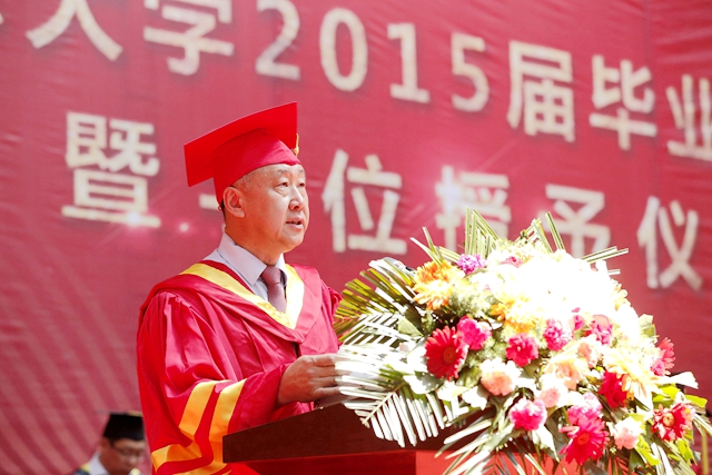 齊平至正,大道中行,騰蛟起鳳,飛舉遠(yuǎn)征。從青澀懵懂的少年到睿智成熟的青年, 2015屆畢業(yè)生一路走來,用勤奮、拼搏和執(zhí)著演繹著人生的精彩、書寫著青春的傳奇。今天的畢業(yè)典禮后,他們帶著母校全體師生的深深祝福揚帆遠(yuǎn)航,開啟人生新的征程。學(xué)校希望2015屆畢業(yè)生牢記學(xué)校領(lǐng)導(dǎo)、老師的殷切囑托,秉承母校“養(yǎng)正毓德、精存自生”的校訓(xùn)精神,見賢思齊,筑夢人生,努力成為有益于祖國、有益于人民、有益于民族、有益于母校的高素質(zhì)人才。母校將與全體校友攜手,凝神聚力,共謀發(fā)展,奮力建成有特色高水平教學(xué)研究型綜合大學(xué),為實現(xiàn)中華民族偉大復(fù)興的“中國夢”貢獻(xiàn)力量。