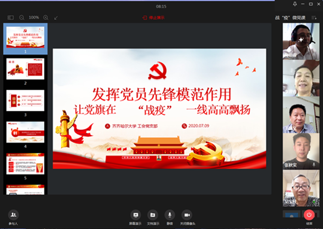7月6日下午,校黨委常委、副校長(zhǎng)李英杰通過(guò)釘釘會(huì)議直播的方式,以《不忘初心,牢記使命,堅(jiān)決打贏疫情防控阻擊戰(zhàn)》為題,為教務(wù)處黨支部全體黨員上了一堂深刻的黨課。結(jié)合疫情防控常態(tài)化的新形勢(shì)和半年來(lái)教務(wù)處黨支部在抗擊疫情中的具體工作,他從明確什么是黨員的先鋒模范作用、戰(zhàn)“疫”新常態(tài)下對(duì)黨員先鋒模范作用的要求、戰(zhàn)“疫”新常態(tài)下如何發(fā)揮黨員先鋒模范作用三個(gè)方面進(jìn)行了詳細(xì)闡述,并針對(duì)學(xué)校期末線(xiàn)上考核工作和2020年秋季學(xué)期開(kāi)學(xué)準(zhǔn)備工作提出了具體要求。李英杰強(qiáng)調(diào),黨員干部要自覺(jué)提高政治站位,主動(dòng)擔(dān)當(dāng),使疫情防控和教育教學(xué)工作兩不誤,要把初心寫(xiě)在行動(dòng)上,把使命落在崗位上,確保各項(xiàng)疫情防控工作落實(shí)落靠,確保在線(xiàn)教學(xué)和在線(xiàn)考核工作平穩(wěn)運(yùn)行。