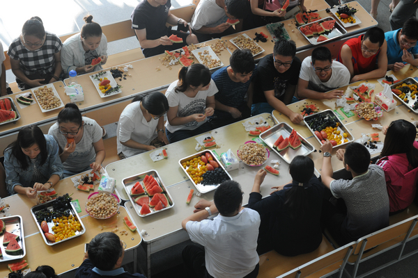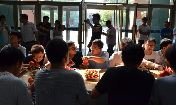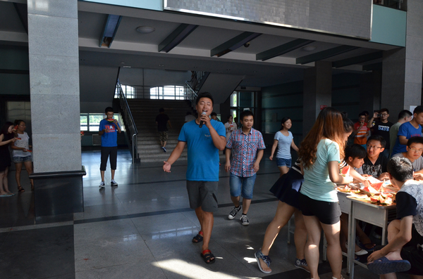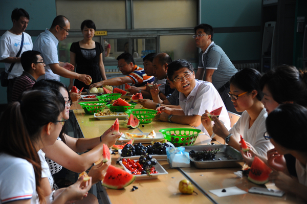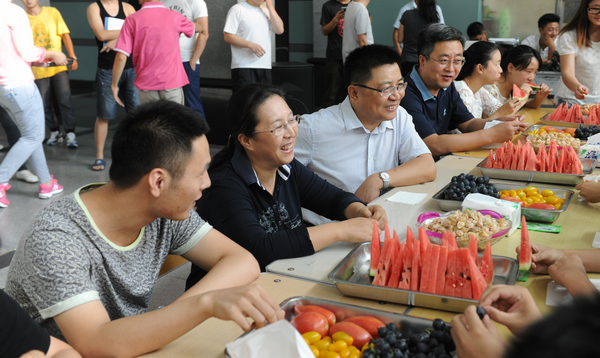 8月5日下午,機關(guān)黨委在中區(qū)教學(xué)主樓大廳組織了首次慰問活動,黨委書記李海紅參加了本次活動,并用自己的工資買來西瓜、葡萄、李子等水果,與在場的同學(xué)一起分享,為他們鼓勁打氣。