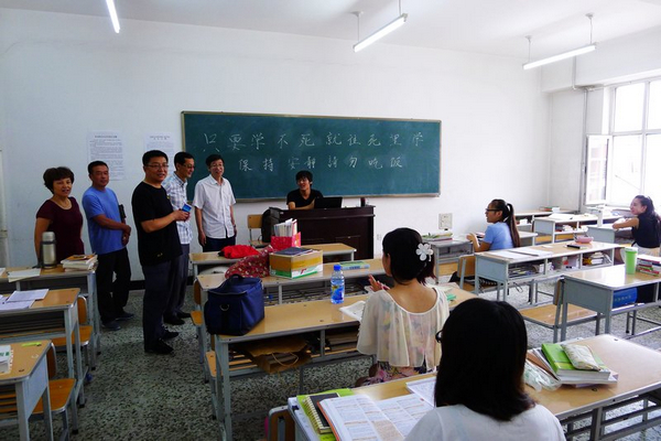 發(fā)布日期:2015-08-19 點擊量:每年暑假,我校都有很多同學(xué)放棄回家,留在學(xué)校復(fù)習(xí)備考。7月22日上午,校黨委書記李海紅一行深入到寢室、教室等地,看望了假期留在學(xué)校的同學(xué),當(dāng)大家走進中區(qū)教學(xué)樓二樓的一間自習(xí)教室,黑板上一句勵志的口號“只要學(xué)不死就往死里學(xué)”讓在場的領(lǐng)導(dǎo)和老師很受感動。