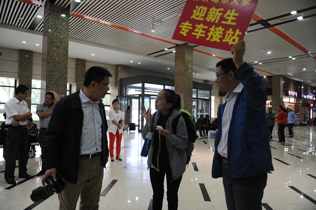 學(xué)校在火車站設(shè)立了迎新接站工作點(diǎn),提供免費(fèi)的接站專車?,F(xiàn)場(chǎng)工作的有關(guān)領(lǐng)導(dǎo)、老師、學(xué)生社團(tuán)志愿者們打著引導(dǎo)牌、揮舞著旗幟,積極有序地迎接剛剛走下火車的新生同學(xué)及家長(zhǎng),組織大家及時(shí)坐上接站班車,順利抵達(dá)學(xué)校。
